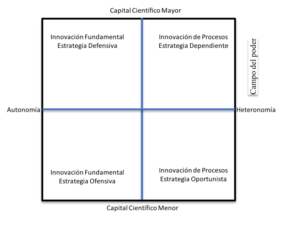 El modelo está estructurado por dos ejes: un eje vertical relativo al grado de capital científico, entendido como “prestigio científico e intelectual” (Timans, Wouters y Heilbron, 2019, p. 195) de los agentes e instituciones y, por ende, de sus producciones; y un eje horizontal relativo al grado de autonomía (o heteronomía) de las posiciones que ocupan esos agentes (figura 5)21. Esta estructura permite describir dos tendencias opuestas (mitades izquierda y derecha del gráfico), según el tipo de innovación científica que es viable: a mayor grado de autonomía corresponde la innovación fundamental (teorías, conocimientos), mientras que a menor grado de autonomía (heteronomía) corresponde la innovación relativa a los procesos (métodos y aplicaciones). Enseguida, se distinguen cuadrantes que corresponden a cuatro tipos de estrategias, puestas en juego por los agentes en función de los beneficios esperados, y que dependen de las posibles combinaciones en el grado de capital científico y el grado de autonomía: “estrategia defensiva” (alto capital, alta autonomía), “estrategia ofensiva” (bajo capital, alta autonomía), “estrategia dependiente” (alto capital, alta heteronomía) y “estrategia oportunista” (bajo capital, alta heteronomía). A diferencia del polo más autónomo (izquierda) donde las luchas entre la ortodoxia y la heterodoxia se libran por la legitimidad propiamente científica, en virtud de la llamada “tensión esencial” (Kuhn, 1978), en el polo más heterónomo (derecha), aunque la batalla principal “también es por el capital científico”, se observa que: