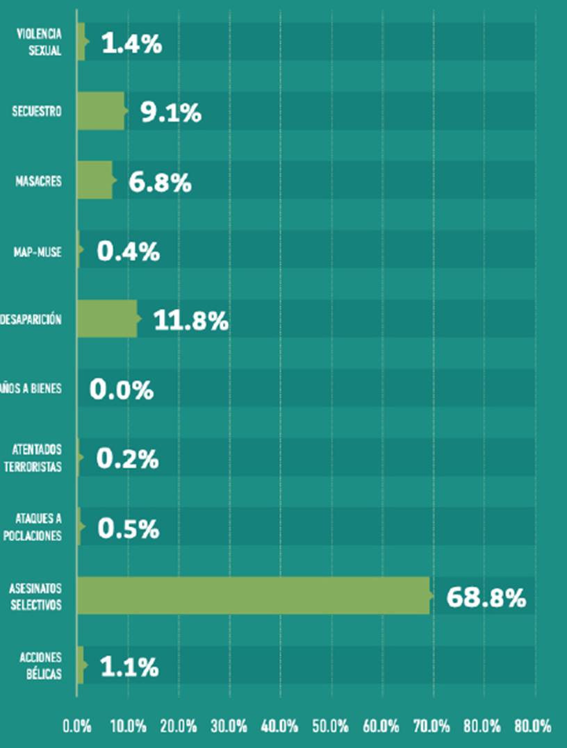 En Colombia se han llevado a cabo terribles hechos de barbarie en todo el territorio nacional, acciones violentas que han afectado principalmente a la población civil, sobre todo en zonas rurales donde prevalece población campesina, afrocolombiana e indígena. Acciones violentas tales como asesinatos selectivos, masacres, torturas, desaparición forzada, despojos, extorsiones, violencia sexual, reclutamiento, entre muchos otros hechos barbáricos han sido recurrentes en numerosos espacios del territorio nacional (CNMH, 2013, p. 108).