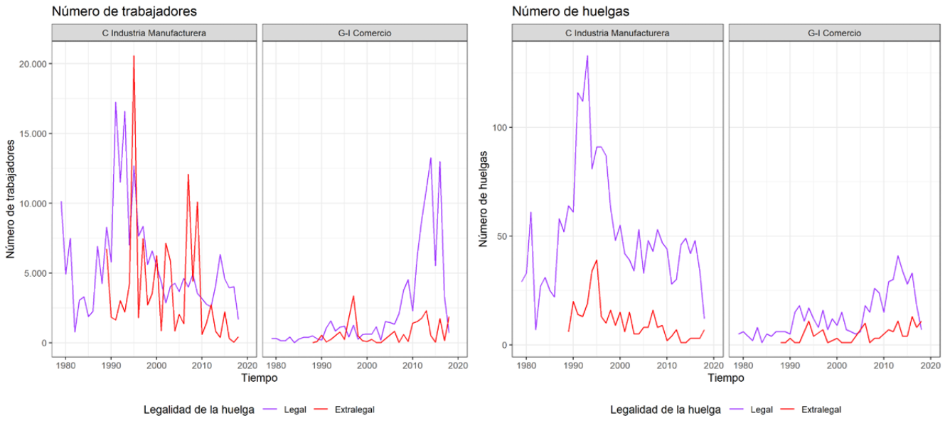 Figura 1: Número de huelgas y de trabajadores comprometidos en estas (1980-2018) en comercio e industria manufacturera