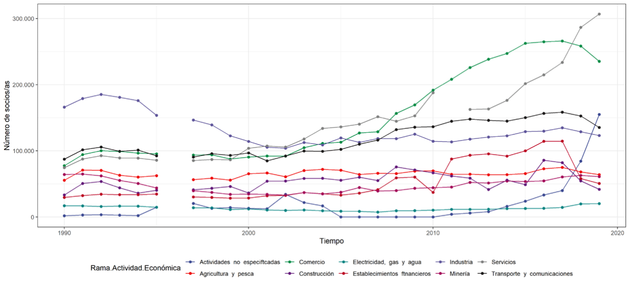 Con el procesamiento y análisis de los registros de la Dirección del Trabajo5 se buscó tener una aproximación actualizada, exacta y sistemática de los socios, socias, tasa de sindicalización y número de sindicatos al interior de cada empresa y de su variación en el tiempo (1979-2020). Estos registros son de libre acceso para usuarios externos de la institución y consisten en un microdato con el detalle de los casi 40 000 sindicatos constituidos en Chile entre 1920 y 20216. Con estos datos se reconstruyó la trayectoria y el estado actual del sindicalismo en lo concerniente a su poder asociativo en las distintas empresas en las que trabajan las y los dirigentes entrevistados.