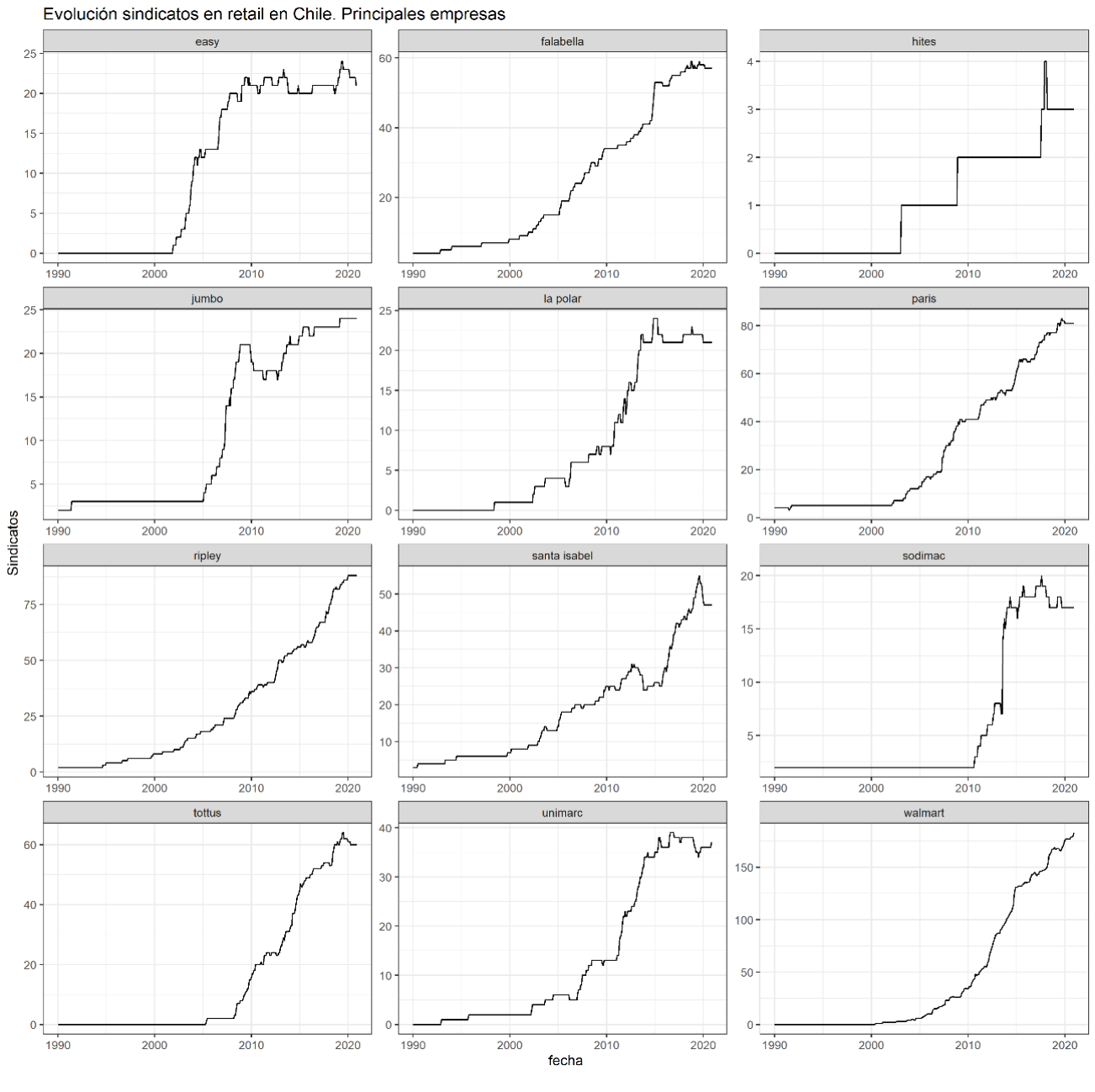 Figura 3: Número de sindicatos en las empresas de las principales cadenas del retail en Chile
