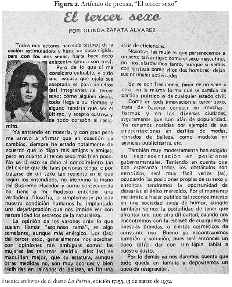 Las alusiones directas al safismo, lesbianismo o amor erótico entre mujeres fueron situaciones que no se nombraron en el Eje Cafetero, y constituyen una representación ausente. Algo similar ocurrió con el transgenerismo, que hizo su presencia en la prensa de la región hasta mediados de los años setenta del siglo XX. El cuerpo "travesti" emerge conrelatos de suplantación de mujeres, historias del tercer sexo y crímenes en las "zonas de tolerancia" (ver la figura 2). Las narraciones de lo "travesti" en la prensa, siempre de varones feminizados, reiteran la constante confusión entre prácticas homoeróticas e identidades de género, asociando la homosexualidad con quiebres a la identidad de género: el homosexual es el travesti, el que quiere ser o actúa como una mujer, el amanerado.