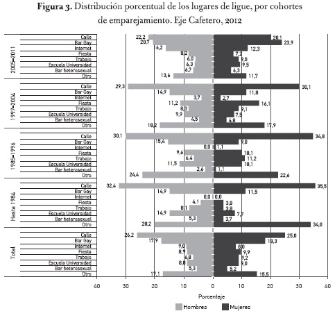Los lugares también pueden estar indicando un proceso de institucionalización en las formas de interacción sexual. En los últimos veinticinco años se evidencia en el Eje Cafetero una mayor institucionalización de la vida erótica y afectiva entre personas con prácticas homoeróticas concentrada en los contextos urbanos7, con mayor predominio en los hombres y expresada en la preponderancia de los bares gais y la internet, en detrimento de la calle, como escenarios que posibilitan el surgimiento de relaciones de pareja. En las mujeres aún existe un predominio de los escenarios de interacción socio-sexual "cara a cara" (ver la figura 3).