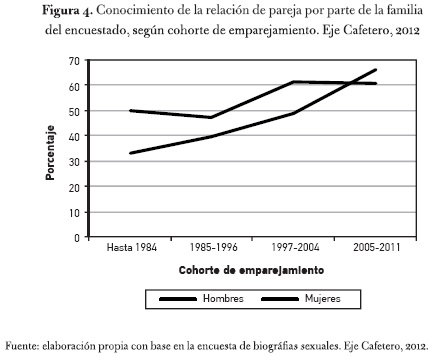 La figura 4 revela un incremento paulatino del conocimiento de la relación de pareja por parte de la familia. Para los hombres, pasa del 32 % al 65,9 %, y para las mujeres, empieza en un 53,6 % hasta llegar a un 60,8 % en la última cohorte. El proceso de coming out8, como experiencia colectiva propia de la cultura gay-lésbica y, la estructura familística de la sociedad colombiana tienden a derivar en una articulación no antagónica del emparejamiento entre personas del mismo sexo en el esquema de la "gran familia parental" y, por 10 tanto, en su institucionalización como una forma alternativa de proveer afecto y cuidado a alguno(s) de su miembros.