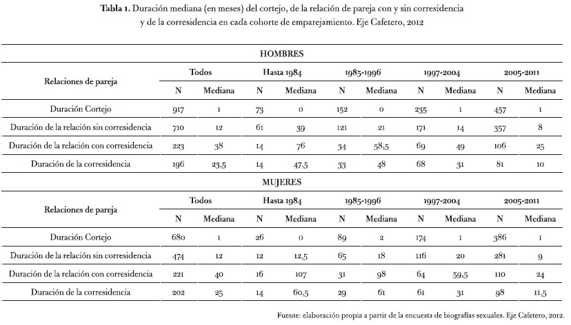 En cuanto a la duración de las relaciones de pareja en los últimos 35 años, se halló que los emparejamientos entre varones y mujeres, con y sin corresidencia (ver la tabla 1), duraron más en los momentos de mayor crecimiento de la epidemia del VIH-SIDA y tienden a disminuir en el último periodo analizado. La presencia de la epidemia es un factor por considerar en el establecimiento de relaciones de pareja de mayor duración que apostaron por la corresidencia o cohabitación, aunado al tipo de acuerdo sexual cerrado que ha predominado en la construcción de este tipo de emparejamiento.