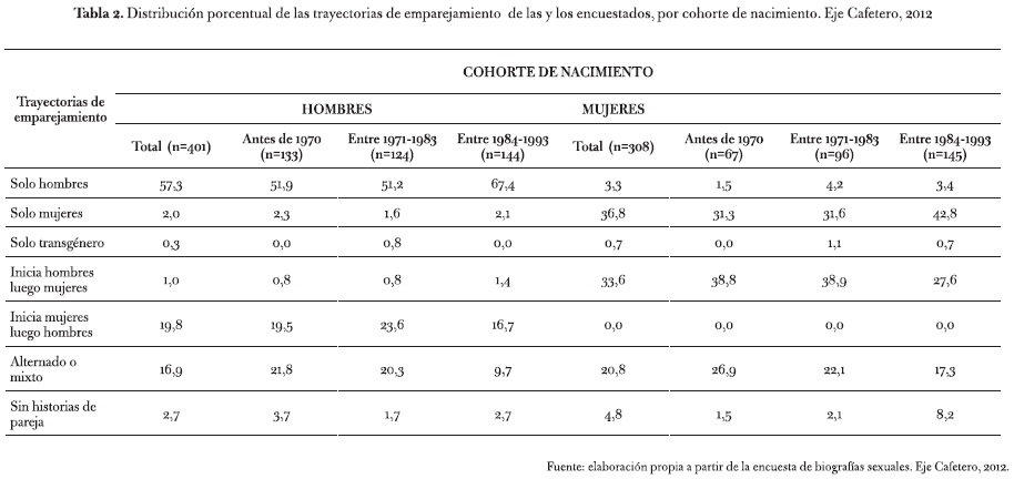 A partir del análisis de las biografías asociadas con el establecimiento de relaciones de pareja fue posible construir tipos de trayectorias o formas de interacción sexual que reflejan las preferencias o las oportunidades que las personas tienen para construir la afectividad y el enamoramiento con otros/as. En principio se identifican siete patrones de emparejamiento (ver la tabla 2); los tres primeros señalan la exclusividad o la preferencia por un sexo/género en la construcción erótico-afectiva: trayectorias exclusivas con hombres (H-H-H), con mujeres (M-M-M) o con personas transgéneros (T-T-T). En el primer tipo se ubica el 57,4 % de los encuestados, valor un poco más bajo en las cohortes adulta e intermedia, y 10 puntos porcentuales más alto entre los más jóvenes encuestados. Estos hallazgos son consistentes con resultados de otras investigaciones adelantadas, especialmente en México9.