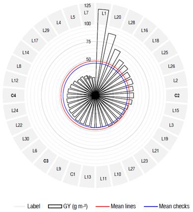 According to the presented results, it was observed that among all the material studied, line L1, showed elevated values for all the agronomic traits such as the NS, SW, TKW, and GY that give opportunities for wheat breeders to exploit its potential for breeding purposes. Lines L20 and L28, and to a lesser extent L16 and L18 also appeared as desirable entries as they exhibited better yield performances when compared to other wheat genotypes including control checks (Figure 1). These five promising lines also surpassed the rest of the lines and check varieties for other desirable traits such as NS, SW, and TKW; and proved better than control checks for stress tolerance-related traits including RWC, Inj, and CT.