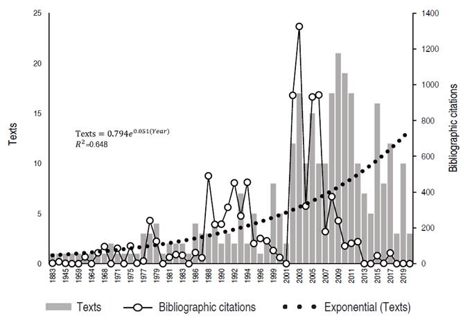 Figure 1: Temporal evolution of scientific texts and bibliographic citations where the species B. alicastrum was object of study from 1883 to 2020.