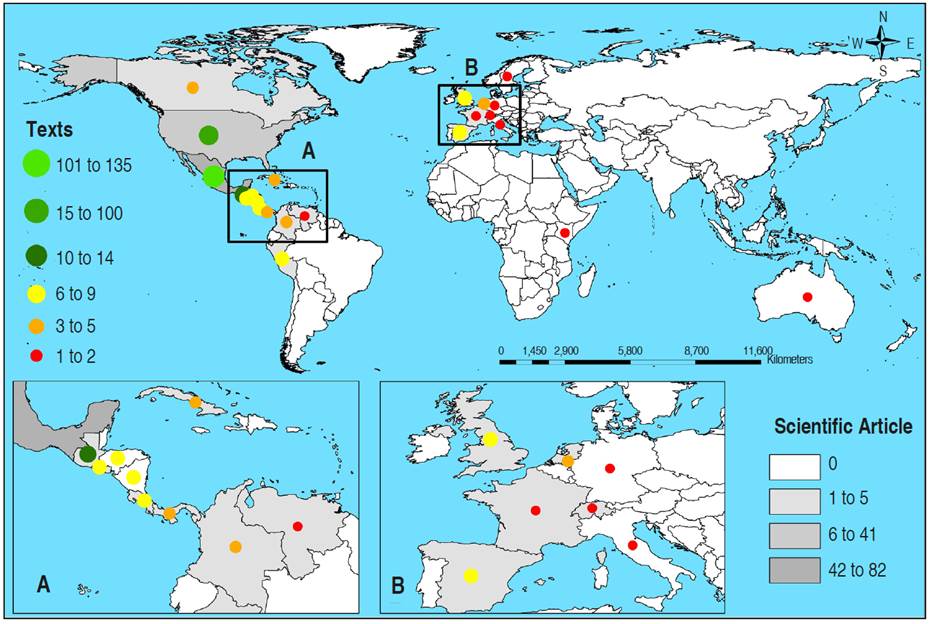Figure 2: Spatial location at the international level of the productivity of texts where the species B. alicastrum was the object of study from 1883 to 2020. A: Latin American countries; B: European countries.