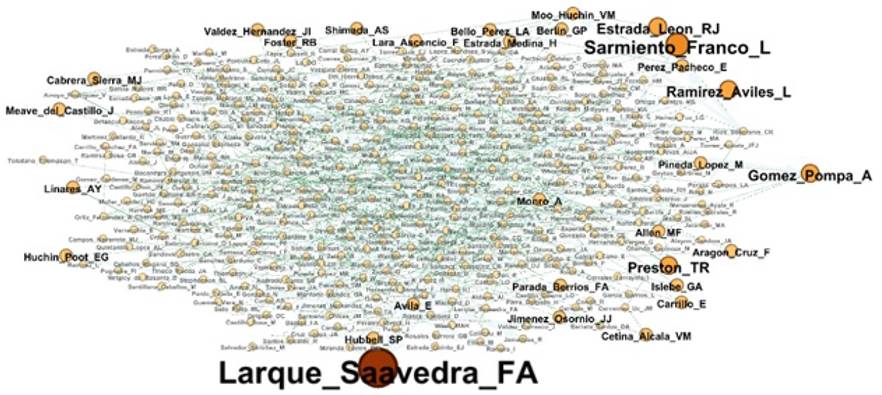 Figure 3: Network of authors and coauthors at the global level who have developed studies where the species B. alicastrum was the object of study from 1883 to 2020. The size of the node corresponds to its productivity.