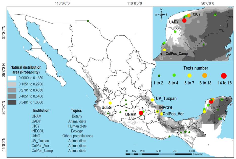 Figure 4: Spatial relationship of the academic and research institutions in Mexico that have developed studies where the species B. alicastrum was the object of study from 1883 to 2020, with the potential probability of natural distribution of B. alicastrum taken from (Santillán-Fernández et al., 2021a).