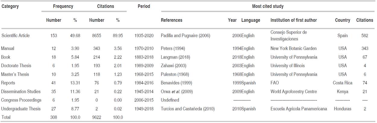 Table 1: Frequency and bibliographic indicators of the most cited studies per type of text where the species B. alicastrum was the object of study from 1883 to 2020.