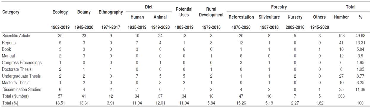 Finally, the texts were also classified according to the type of academic product (CONACYT, 2021a), into: 1) Scientific article, which included texts published in journals with ISSN (International Standard Serial Number); 2) Book, texts published by editorials with ISBN (International Standard Book Number); 3) Thesis: Undergraduate, Master's and Doctorate's; 4) Manual, including those documents without ISSN or ISBN where instructions are set out for the collection, dissemination and harvest of the species; 5) Complete congress proceedings; 6) Dissemination work, which included newspaper articles, interviews and online texts where opinions or advances are expressed that have not been subjected to a process of scientific review; and 7) Report, which included studies that only describe topics around the species, and were reported as products of research projects.