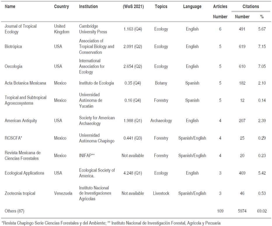 From the 308 texts analyzed, 153 were scientific articles that were published in 97 scientific journals. Of the scientific articles, 28.76% (44) were concentrated in 10 scientific journals, which also represented 30.97% (2681) of the bibliographic citations for scientific articles (Table 3). Among these 10 main journals, 9 were from American countries: Mexico (4), USA (4), and Venezuela (1). For the case of the journals in Mexico and Venezuela, they mostly published in Spanish and did not have JCR (Journal Citation Reports) impact factor or had a low factor that placed them in the categories Q3 and Q4. The journals with the highest number of bibliographic citations published in English and showed JCR impact factors higher than 1, which allowed them to be placed in categories Q1 and Q2 (WoS, 2021).