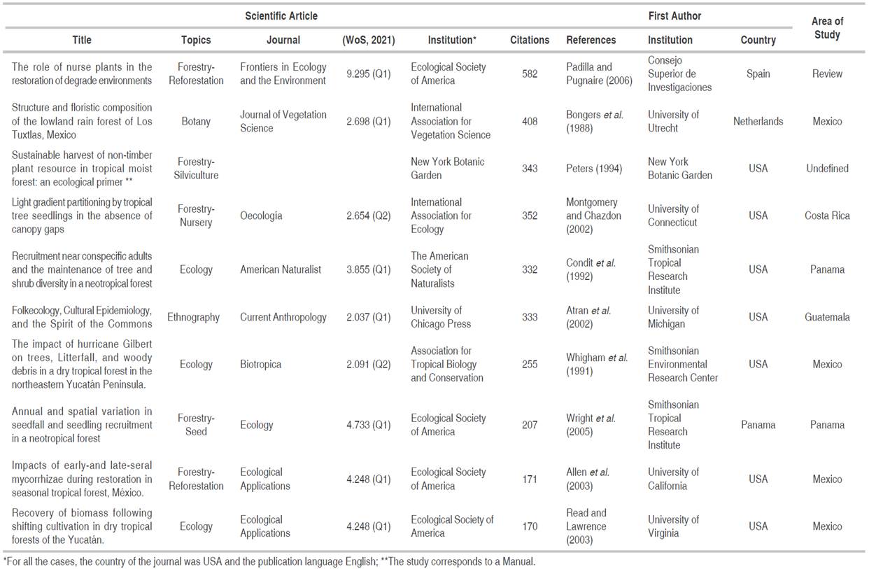 Among the 10 most frequently cited studies about the species B. alicastrum, seven belong to a first author whose institution of adscription is in the USA and only one study corresponds to a researcher in Latin America (Panama); they have all been published in English and in journals of English-speaking origin with impact factors higher than 2 (Q1 and Q2) (WoS 2021) (Table 4). However, the fact stands out that the study areas are located spatially in Latin America: Mexico (4), Panama (2), Guatemala (1) and Costa Rica (1), where the species presents a broad natural distribution (Peters and Pardo-Tejeda, 1982).