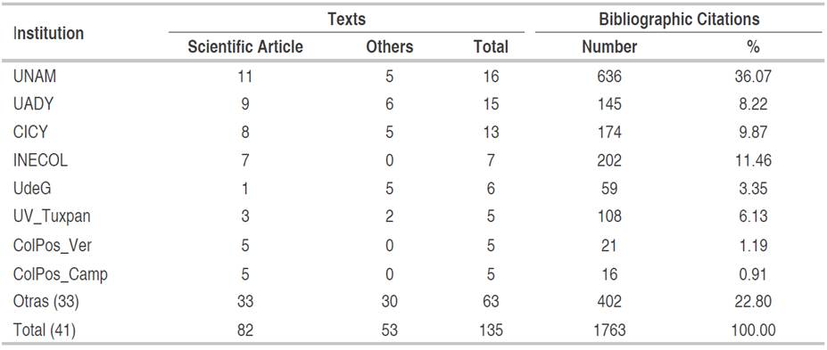From the 135 texts, 72 (53.33%) are developed in eight out of 41 institutions, taking as reference the institution of adscription of the first author; 60.74% (82) were scientific articles, and 39.26% (53) other types of texts. The institutions with the highest productivity were: UNAM (16 studies), UADY (15), CICY (13), INECOL (Instituto de Ecologia A. C., 7), UdeG (Universidad de Guadalajara, 6), UV_Tuxpan (Universidad Veracruzana campus Tuxpan, 5), ColPos_Ver (Colegio de Postgraduados campus Veracruz, 5) and ColPos_Camp (Colegio de Postgraduados campus Campeche, 5) (Table 5). According to CONACYT (2021b), these institutions have strengthened their postgraduate programs in the biological and agro-silvo-pastoral sciences in the National Register of Quality Post-Graduate Programs (Padrón Nacional de Posgrados de Calidad, PNCP), which has allowed them to take initiatives for the development of research on the species B. alicastrum.
