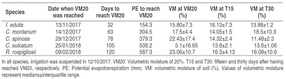 Considering that bags, where trees were growing, were impervious, moisture depletion was directly related to transpiration (Joy et al., 2020). The higher number of days necessary to reach VM20 of I. edulis in comparison to R. rospigliosii might be related to their relative growth, with I. edulis with the highest growth rate and R. rospigliosii with the lowest. Mitchell et al., (2012) mention that rapid growth species like Eucalyptus globulus and Eucalyptus smithii use more water than Pinus radiata, which has a lower growth rate.