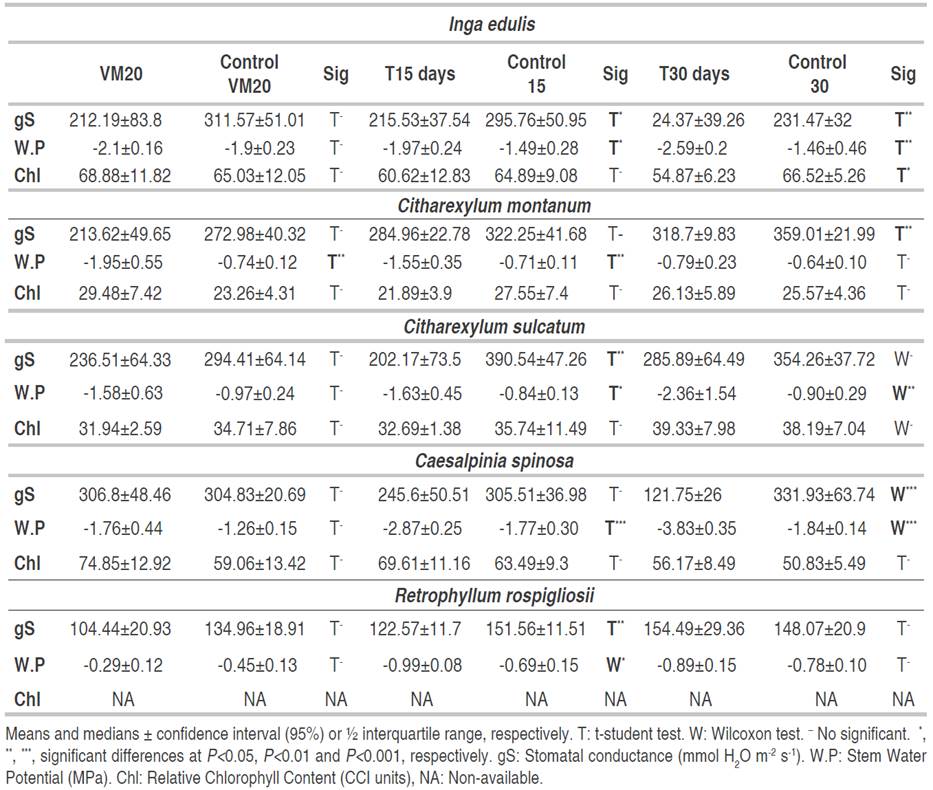 At a volumetric water content of 20%, neither the chlorophyll nor the water status variables nor were affected, except the stem water potential of C. montanum (Table 1). After 15 days of having reached VM20 (T15), stomatal conductance and stem water potential decreased in I. edulis, C. sulcatum and R. rospigliosii and there was only a decrease in stem water potential for C. montanum and C. spinosa. After T30, several physiological variables felt: all in I. edulis, stomatal conductance and stem water potential in Caesalpinia spinosa, stomatal conductance in C. montanum, stem water potential in C. sulcatum and none of them in R. rospigliosii (Table 1). A soil moisture content of 20% VM may have been enough to supply the water requirements of all the species, except for C. montanum. In the soil used for this experiment 20% VM equals a tension of ~70cb which is not enough to induce water deficit in plants (Intrigliolo and Castel, 2004).