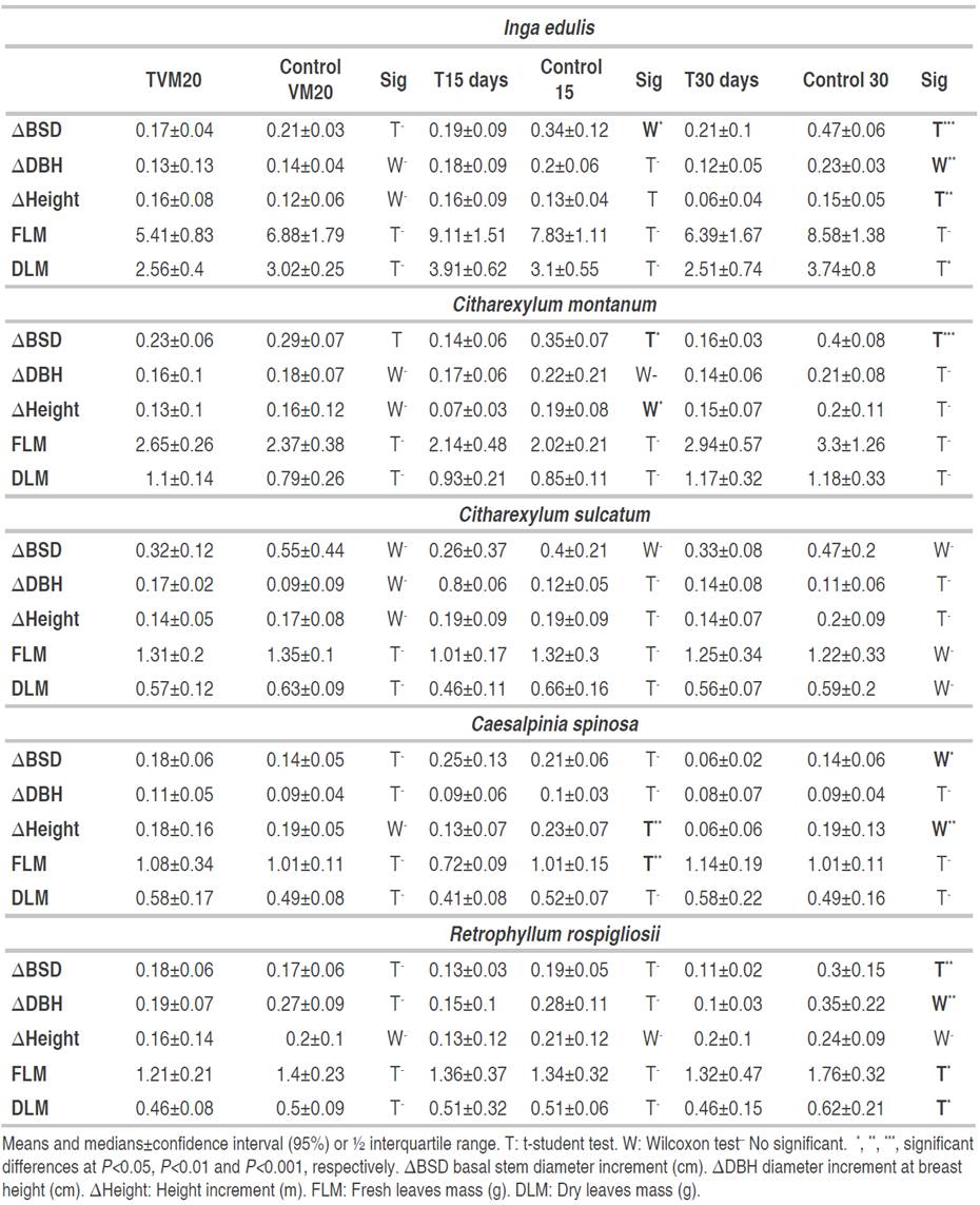 As time passed, the effects of water deficit on tree growth were more severe (Table 3). The longer was the water deficit, the higher were the differences between the control and water deficit treatments. For example, after 15 days of having reached VM20, a few growth variables were affected by water deficit decreasing until 40%. However, after 30 days all the variables from all species decreased more than 50% except FLM and DLM. After the soil had reached a volumetric water content of 20%, none of the growth variables was affected except ΔBST in C. montanum. After 15 days, growth variables diminished in I. edulis, C. montanum and C. spinosa but not in C. sulcatum and R. rospigliosii. Meanwhile, after 30 days, at least one growth variable, except in C. Sulcatum, decreases in all species. A permanent growth reduction after 30 days of water deficit was also reported by Cordero (2016) in the same species C. spinosa after reducing water supply for more than 20 days.