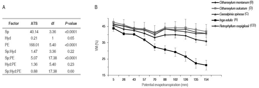 Figure 1: A) Effect of Species, Hydroabsorbent, potential evapotranspiration and their interaction on volumetric water content (ANOVA-Type Statistic profile analysis) and B) Graph profile analysis plot for volumetric water content. sp: Species, Hyd: Hydroabsorbent, PE: Potential Evapotranspiration, ATS: ANOVA Type statistic, df: Degree of Freedom VM: Volumetric moisture. In B; species following by the same letters (C and D) are not significantly different according to non-parametric profile analysis (P<0.01).