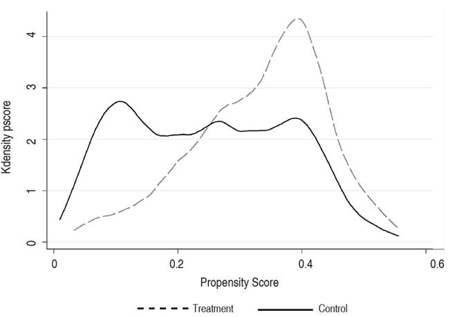 The common support shows the probabilities of participation for both UPAs with credit and those without. As can be seen in Figure 1, exist a common support, since each UPA with credit and with a defined probability can be associated or "matched" to a unit without credit with a similar probability.