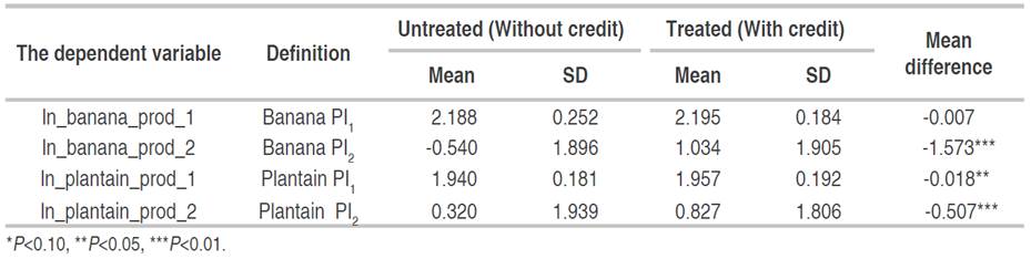 This section presents the descriptive statistics corresponding to the sample used to estimate the impact of agricultural credit. According to the results of the descriptive statistics alone (Table 1 and Table 2), when the agricultural credit is approved, the average value of the PI 1 for plantain crops and PI 2 for plantain and banana crops are higher and significantly different, this suggests a possible positive correlation between access to credit and the productivity indexes studied. However, in the case of PI 1 for banana crop, although it presents higher average values for the treated group, the difference is not statistically significant, suggesting that there is no positive effect of agricultural financing on this.