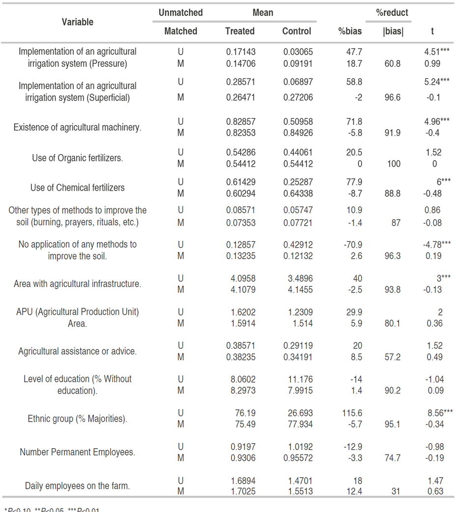 In general, as can be seen in Table 1 and Table 2, the groups have different means in the group that had access to agricultural credit and in those that did not receive it, which leads to the conclusion that they are not randomly distributed. Therefore, these differences confirm the need to create a control group that is comparable to the group that accessed agricultural credit and to apply the methodology proposed in this research.