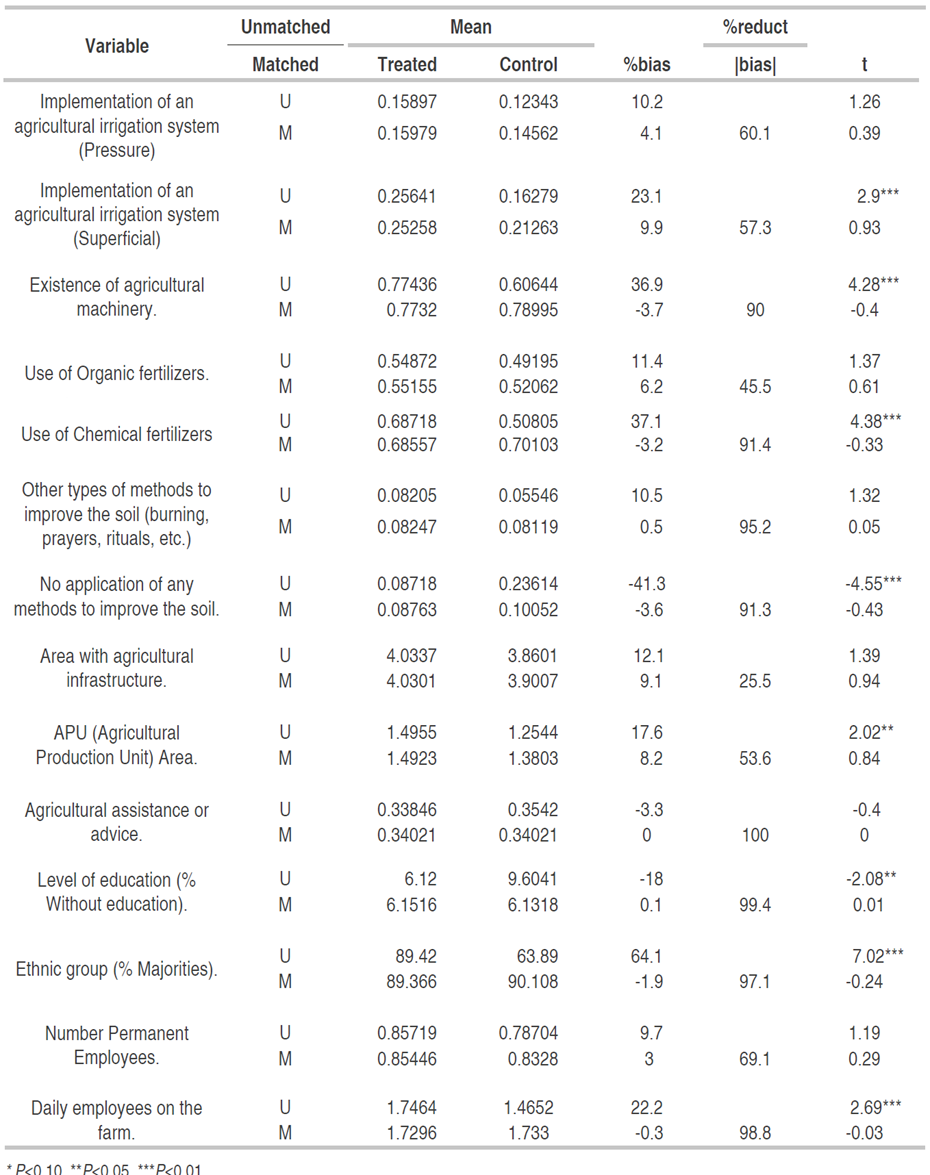 Before using PSM, the samples must pass the balance test, which ensures that there is no systematic difference between the treatment group and the control group after pairing. In other words, it is necessary to verify that the post-pairing rocking has corrected the problem of selection in observables, which was evidenced by the tests of differences of means carried out in the item "Descriptive statistics". As can see below, Table 3 and Table 4 show balance test results for each crop.