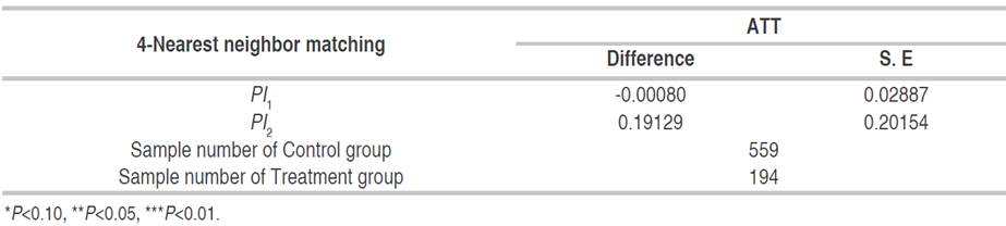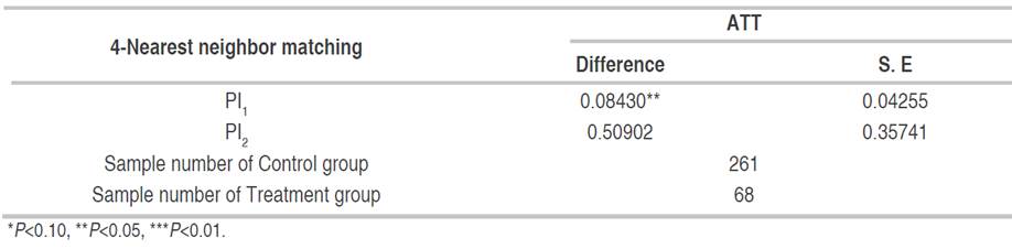 As can be seen in Table 5, the impact of agricultural credit on PI 1 is positive and significant (8.4%). Therefore, it can be affirmed that banana producers who have access to agricultural credit, they achieve an average 8.4% increase in tons produced per hectare, contrary what was initially suggested in basic analysis of descriptive statistics, where a possible non-relationship between access to agricultural credit and the PI 1 was intuited. To get an idea of the magnitude of the effect calculated with PSM methodology in terms of the unit of measurement of the result variable, an average an increasing the yield from 8.8 to 9.5 t ha-1 is expected, in other words an increase of almost 1 t ha-1.