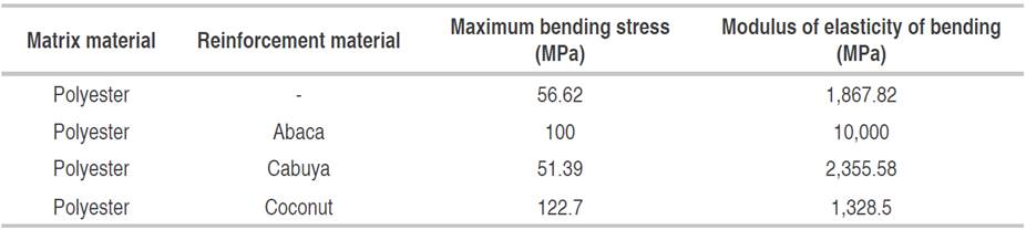 The data are reinforced by the studies by Llanes-Cedeño et al. (2019), Karthik and Arunachalam (2020) and Widnyana et al. (2020) in which they evaluate the same parameters for polymers reinforced with abaca, with cabuya, and with coconut fibers. In this case, the data in Table 2 shows that the use of abaca fibers stands out in the modulus of elasticity, but also provides an improvement in bending stress.