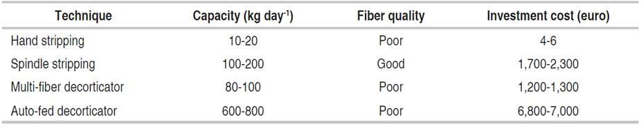 According to Waller and Wilsby (2019) a considerable difference between the ways of bundle extraction exists, for instance, using the hand stripping technique produces about 20 kg of fiber bundles per day, while the spindle stripping technique produces between 80 kg and 120 kg per day, while the decortication technique produces 140 kg per day being the most efficient on terms of quantity but with a lower quality than the spindle method.
