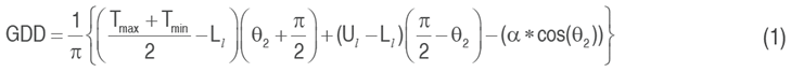 The heat sum method was used to consider the temperature effect on plant growth and development as accumulated growing degree days (GDD) according to Equations (1) and (2). Riaño et al. (2005) suggested the simple sine method between the appropriate physiological temperature thresholds (lower limit Ll and upper limit Ul) because a symmetric daily temperature behavior is assumed for the maximum temperature with equal minimum temperatures typical of tropical conditions. For papaya, these limits are 15 to 32 °C, respectively (Allan 2002).