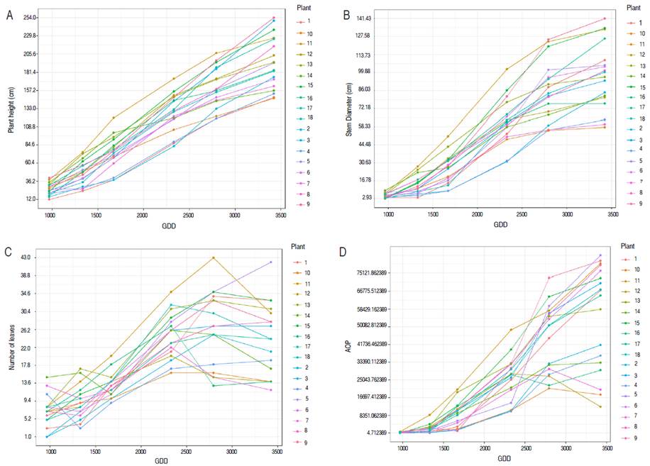 An accelerated development was evidenced for LN between the second and fourth measurements (Figure 2C). Between the fourth and fifth measurements, LN decreased, coinciding with the flowering stage (90% of the plants) at 2067 GDD. Flowering is a phenological stage where photo-assimilates are used to provide the energy required for floral differentiation. The stem and leaf growth rate decreases due to the indeterminate growth habit of papaya with simultaneous vegetative growth, flowering, and fruiting (Singh et al. 2010). Thus, presenting competition between vegetative and reproductive sinks (Zhou et al. 2000). Conversely, for AOP, all individuals showed very similar values in the first stages of growth. However, some changes separated two groups between the fourth and fifth measurements (Figure 2D).