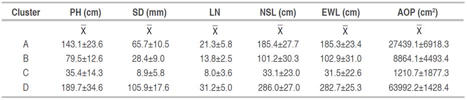 Table 1: Values of plant height (PH), stem diameter (SD), number of leaves (LN), NS length (NSL), EW length (EWL), and the area occupied by the plant (AOP) determined in four clusters of UN Cotové papaya variety plants.