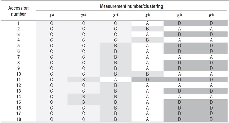 One of the difficulties in this first grouping into four clusters was that separating the groups did not discriminate the individuals or the states of specific development in the experimental units (Table 2). On the contrary, the groupings were made from the magnitude of each variable vector, determined by the plant age, associated with the evaluation time (measurement). Cluster C grouped the lowest values, with 100% of the data recorded in the first, 83% in the second, and 22% in the third. The benefit of this first grouping was identifying when the plants presented differences, the essential information in a plant breeding program for recognizing outstanding quality parameters from selecting individuals with characteristics of interest.