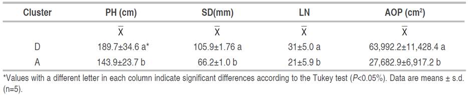 Figure 1 shows the behavior of the variables PH, SD, LN, and AOP as a function of the accumulated GDD for each measurement. In general, from the fifth measurement, two groups of plants were differentiated; for SD, the separation occurred from the fourth measurement. However, at the end of plant development, there four groups were identified (Figures 2A and 2B). In the third measurement, a stem growth reduction was observed near 2330 GDD, similar to those found by Almeida et al. (2003), which shows that changes in growth and development occur regardless of the location or sowing season. However, the behavior of the variables depends on the accumulation of GDD or thermal temperature.