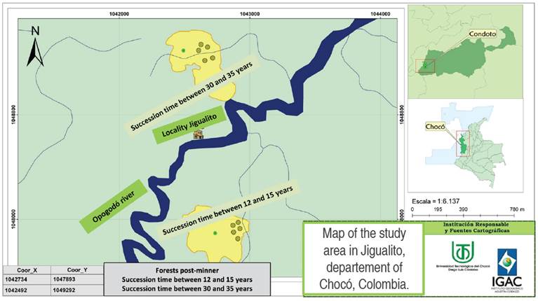 This study was carried out in forested areas previously degraded by open-pit gold mining, in the locality of Jigualito (5°06'01" N - 76°32'44" W), municipality of Condoto, in the Colombian Pacific (Figure 1).