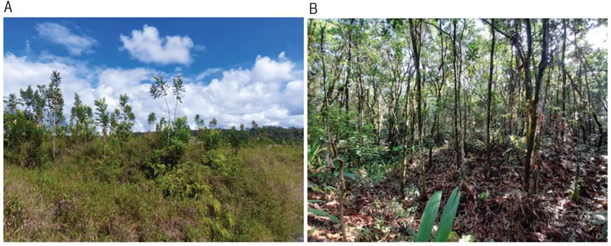 Figure 2: Forested areas previously degraded by open-pit gold mining, in the locality of Jigualito, municipality of Condoto, in the Colombian Pacific. Where A. are areas with a succession time of between 12 to 15 years. B. Are areas with a succession time of between 30 to 35 years.