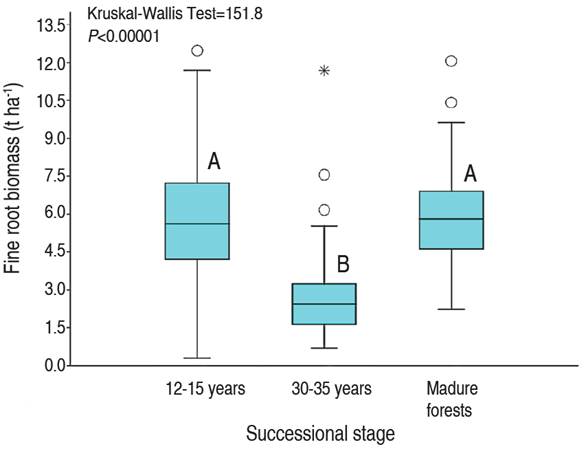 Figure 3: Fine root biomass as a function of successional stage in abandoned mines in Jigualito, Colombian Pacific. The letters "A" and "B" indicate significant differences.