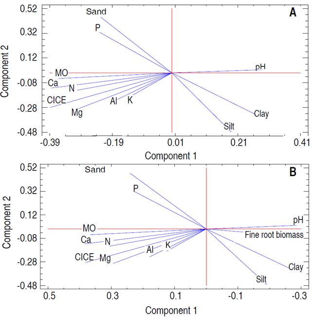 Figure 4: Principal component analysis (PCA) for fine root biomass variables and soil parameters in abandoned mines in Jigualito, Colombian Pacific. Where the component 1 eigenvalue=4.41 (36.7% variance); component 2 eigenvalue=3.03 (25.28% variance) of the total variation.