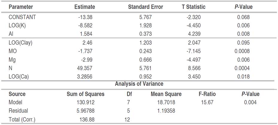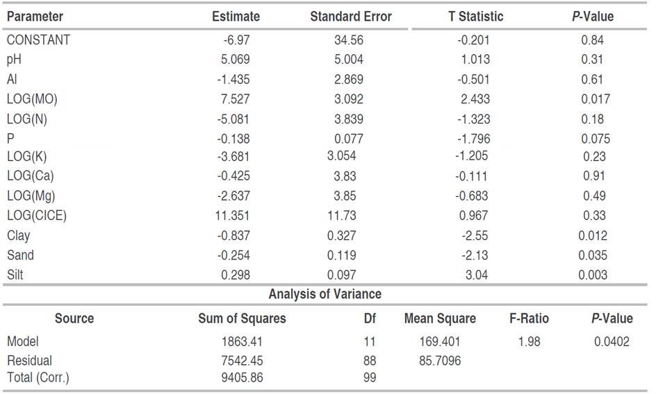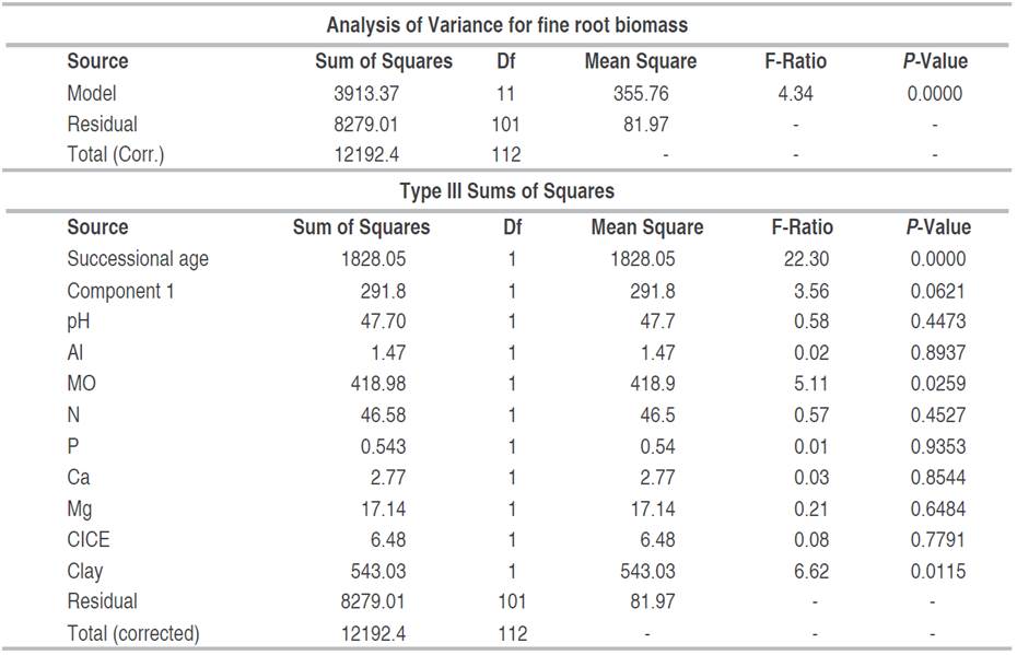 Table 3: Multiple regression of fine root biomass as a function of edaphic variables in abandoned mines in Jigualito, Colombian Pacific. Where R2=95.64%, R2 (adjusted)=89.53%. Backward variable selection method. (30-35 year).