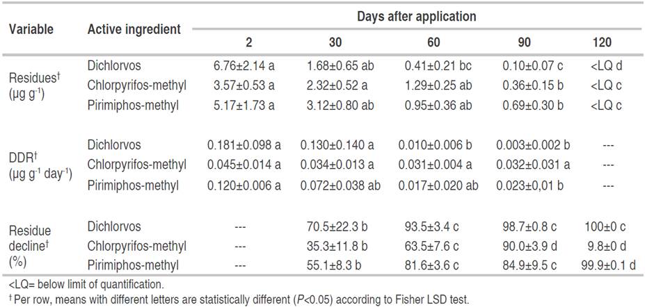 Regarding the HL of organophosphorus pesticides, previous studies have found high variability (0.7 to 55 days) (Fantke and Juraske, 2013). In this study, HL was found to be greater for CPM (38.8 days) than for PMM (30.1 days) and DDVP (1.3 days); these differences were associated with the physico-chemical characteristics of each active ingredient (Balinova et al., 2006; Lalah and Wandiga, 2002). Reported estimates of HL vary between two weeks for DDVP in wheat (Holland et al, 1994), between 70 and 169 days for CPM (Afridi et al., 2001; Fleurat-Lessard, 1998), depending on the grain moisture, and 99 days for CPM in soybean (Zhao et al., 2014). In addition, a slower dissipation has been reported for PMM, with a HL between 100 and 490 days in wheat (Afridi et al., 2001; Holland et al., 1994) and between 85 and 96 days in corn, depending on the dose (Alleoni and Baptista, 2001). The results of our study suggest that the HLs here observed in soybean are lower than those reported in other studies of soybean grains.