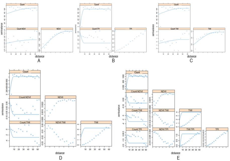 Figure 4: Linear model of co-regionalization models of count Oligonychus sp., A. NDVI; B. TWI; C. TPI; D. NDVI/TWI and E. NDVI/TWI/TPI.