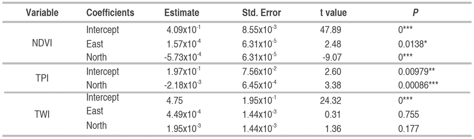 Table 2: First-order polynomial models of DEM, NDVI, TPI and TWI.