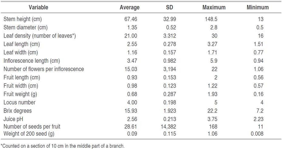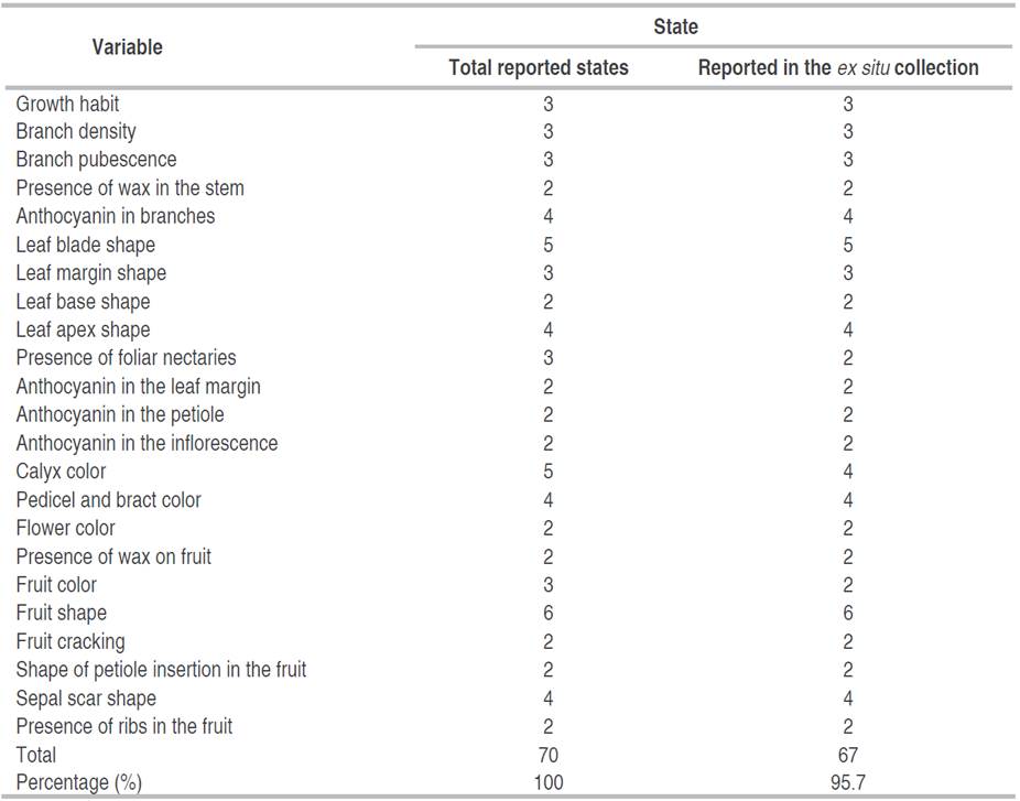 Five qualitative variables were included in the stem level descriptor; seven were selected for the leaf, four for the inflorescence and flower, and eight for the fruit, for a total of 24 variables (Table 1). In the ex situ characterization of 102 materials carried out with the final proposal of the descriptor, polymorphism in 24 qualitative traits were found, with the presence of 67 states out of the 70 included in the list of the descriptors for the species (95.7%) (Table 2). This result indicates a broad morphological variability related to attributes of this nature. The only states not observed in this characterization were large foliar nectaries found only in one specimen deposited in the "Josep Cuatrecasas y Arumí" herbarium of Universidad Nacional de Colombia - Palmira Headquarters. The color of its calyx is red-wine, and the color of the fruit is blue.