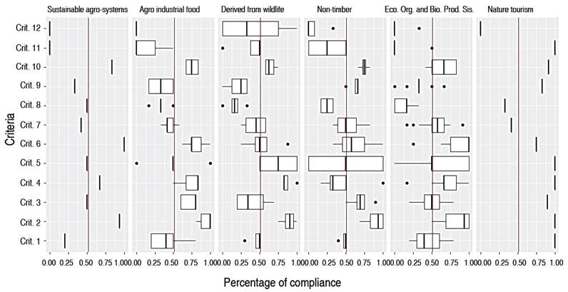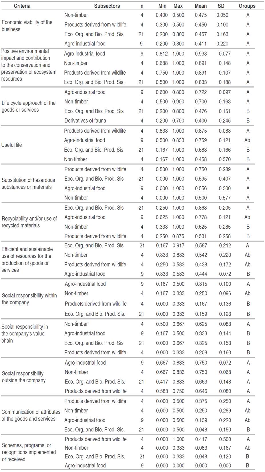 Findings indicated that agro-industrial and non-timber businesses had higher averages than businesses with products derived from wildlife and ecological production systems, regarding essential aspects of sustainability in the life-cycle approach criteria. Businesses in the ecological production systems subsector showed the highest averages on recyclability and use of recycled materials criteria, showing statistically significant differences with non-timber and businesses with products derived from wildlife, which had the lowest scores.