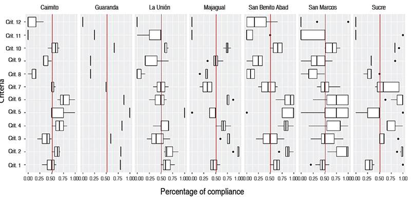 The comparative analysis of the criteria compliance and location of the companies in the municipalities of La Mojana and San Jorge regions was able to detect that the criteria that exceeded 51% of compliance and have strengths are: positive environmental impact, useful life, substitution of hazardous substances or materials, recyclability and/or use of recycled materials and social responsibility outside the company; and that they were located in the municipalities of San Benito Abad, San Marcos, and Sucre. It detected that the main weaknesses were: efficient and sustainable use of resources for the production of goods or services, social responsibility within the company, social responsibility within the value chain of the company, communication of attributes of goods and services and schemes, programs or recognitions implemented or received; specifically in the municipalities of La Unión and Caimito, as shown in Figure 2.