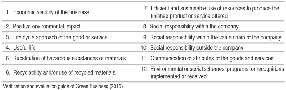 The study used the methodology of MADS (2014) and Cerón and Lasso (2020) by applying a survey to business' owners using the tool - Form version 1.2 F001-2016 (verification sheet 2), which evaluated a set of indicators on 12 verification and evaluation criteria for green businesses as framed within the National Plan of Green Businesses (ONNVS 2014; Duarte Ramírez 2019; Martínez et al. 2020 ), as shown in Table 1.