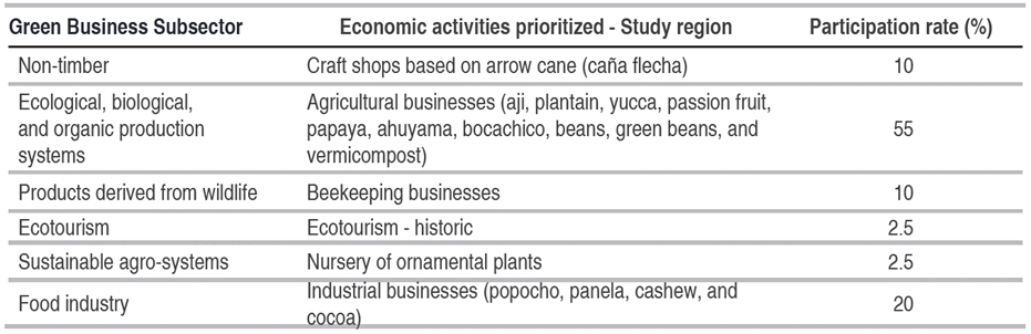 It was determined that La Mojana and San Jorge subregions of the department of Sucre have greater participation in the green business subsector "systems of biological and organic ecological production," with a high development potential, which could promote a new market line in the area, considering the sustainability criteria established by the Ministry of Environment and Sustainable Development - MADS. On the other hand, the main strengths of the businesses evaluated were found in the criteria related to environmental aspects. In contrast, the main weaknesses were focused on the economic and social sector criteria. These findings suggest that La Mojana and San Jorge sub-regions have more potential for land use activities and nature tourism. However, it is necessary to prioritize these sectors through investment, and technical and financial support, contributing to achieving the country's goals proposed in CONPES 3934 and the SDGs.