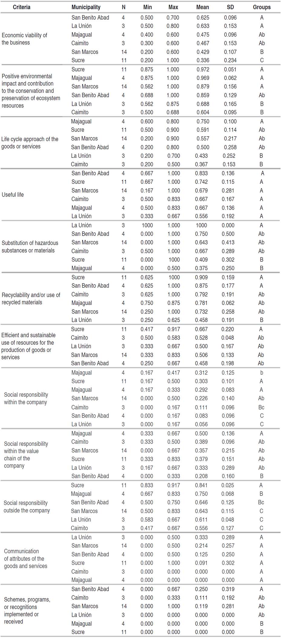 Significant differences were found among the companies in the municipalities of San Benito Abad and La Unión regarding the compliance of economic viability of the business criteria, having the highest averages, compared to the municipalities of San Marcos and Sucre, which had the lowest averages. However, the businesses located in the municipalities of Sucre, Majagual, and San Marcos, although they showed the highest scores in the positive environmental impact criteria, did not register statistically significant differences, as is shown in Table 5.